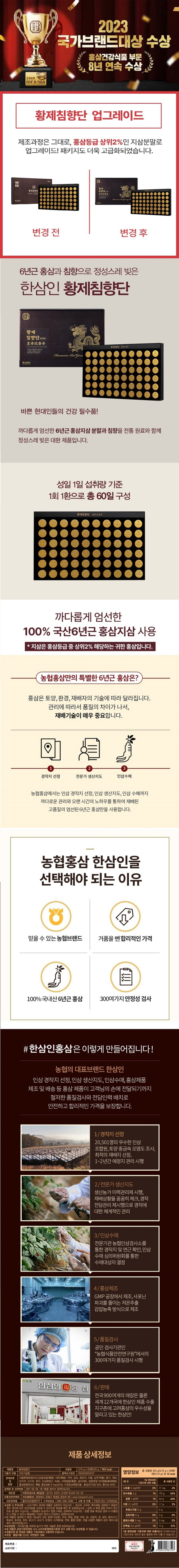 - 귀한 침향과 전통원료의 환상의 배합으로 만들어진 제품 - 침향분말 5% 함유 - 믿을수 있는 농협홍삼 브랜드 한삼인 - 홍삼 침향 산수유 사양벌꿀 녹용 - 피곤하신 분들께 권합니다. - 1일 1회, 1회 1환을 씹어서 섭취 - 휴대와 섭취가 편리한 개별포장 제품 - 선물용으로도 좋은 풍성한 구성 입니다.